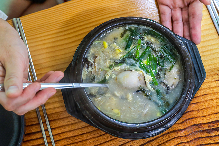 A really refreshing soup is oyster and rice soup. Oysters shipped from Tongyeong every morning look appetizing as they are cooked in a hot broth. The restaurant's secret recipe is seasoning all soups with ground salted shrimp instead of salt. The chewy rice cake slices that appear one by one while savoring the bean sprout and rice soup are also delicacies.