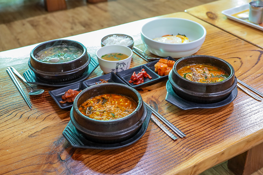 The Gyeongju Kongnamul Gukbap, which boasts a 35-year history serving breakfast every morning, offers four main menus: bean sprout and rice soup, oyster and rice soup, beef and rice soup, and bibimbap. These are good for groups to order and share. When you order soup, they bring it boiled and bubbling in an earthenware pot.
